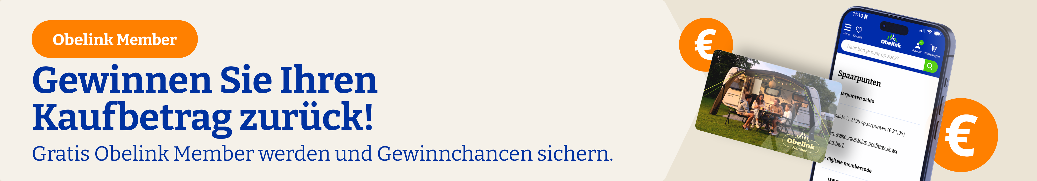 • Nur Produkte, die im Zeitraum vom 1. Oktober 2025 bis zum 31. Dezember 2025 über obelink.de oder in unserem Megastore in Winterswijk mit einer registrierten Membercard oder einem registrierten Membercode gekauft wurden, nehmen an der Verlosung teil. Membercard oder - Code und Newsletter-Abonnement müssen unter derselben E-Mail-Adresse registriert sein.