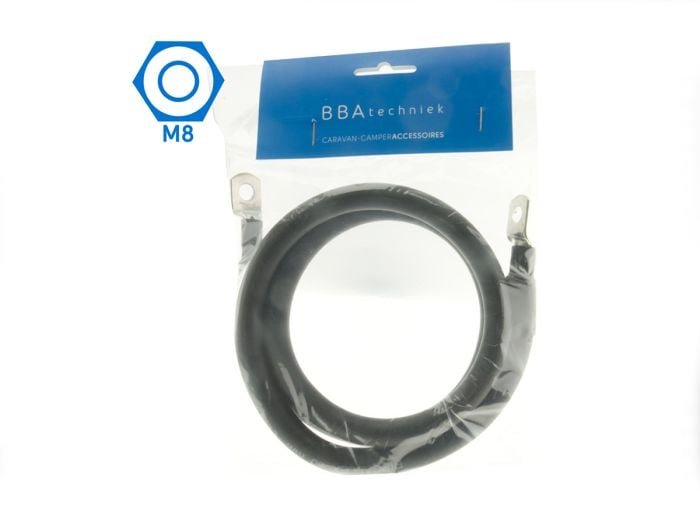 Das vorkonfektionierte Batteriekabel verfügt über 2 M8-Kabelösen und eine Schrumpfschlauchbeschichtung, die eine robuste und zuverlässige Verbindung gewährleistet. Die schwarze Farbe und die flexible Konstruktion machen das Kabel ideal für professionelle und Heimwerker-Installationen.
