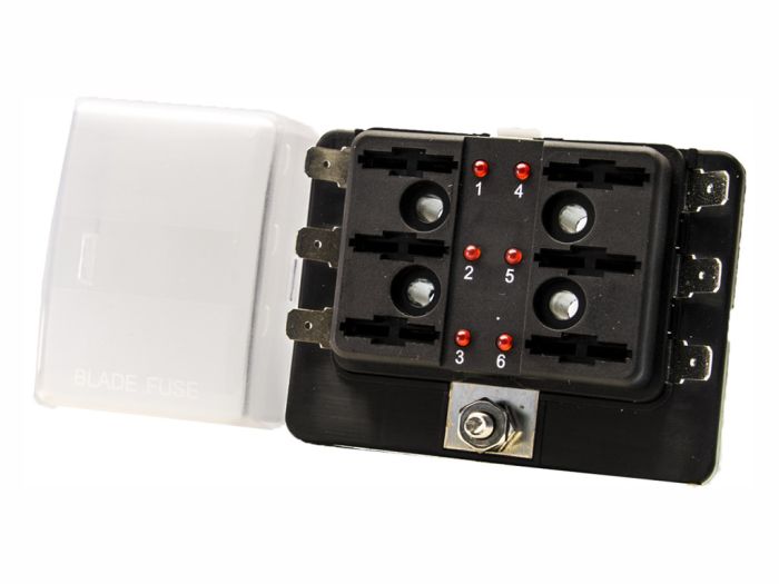 Diese 6-fache Sicherung-Verteilerbox ist für sechs normale Flachsicherungen geeignet. Diese Verteilerbox ist spritzwassergeschützt und meldet mittels einer LED-Leuchte, wenn eine Sicherung defekt ist. Diese Verteilerbox hat Anschlüsse für sechs Flachstecker mit einer Größe von 6,3 mm.