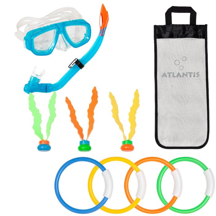Macht das Kind mit dem Spielen unter Wasser vertraut Das Tauchset Dory von Atlantis eignet sich hervorragend zur Verbesserung der motorischen Fähigkeiten von Kindern im Pool! Die unterschiedlichen Formen der Tauchspielzeuge aus diesem Set fördern die Entwicklung der motorischen Fähigkeiten und machen das Kind zudem mit dem Spielen unter Wasser vertraut.Praktische Taucherbrille und Schnorchel Die Taucherbrillen aus diesem Set bestehen aus PVC und verfügen über ein verstellbares Kopfband. Der Schnorchel hat ein schmaleres Mundstück und eine trockene Oberseite, die verhindert, dass Spritzwasser in den Schnorchel eindringt. Sollte dennoch Wasser in den Schnorchel eindringen, können Sie es einfach über das Wasserablassventil ausblasen. Geeignet für Kinder ab 6 Jahren Die Ringe und Algen bleiben aufrecht am Boden des Beckens und sind so leicht zugänglich. Die leuchtenden Farben kommen im Wasser gut zur Geltung. Dieses Wasserspielzeug ist für Kinder ab 6 Jahren geeignet. Spezifikationen: Fördert die motorischen FähigkeitenMacht das Kind mit dem Spielen unter Wasser vertraut Das Set besteht aus 1 Tauchmaske, 1 Schnorchel, 3 Stück Algen, 4 Tauchringen und einer Tasche Geeignet für Kinder ab 6 Jahren