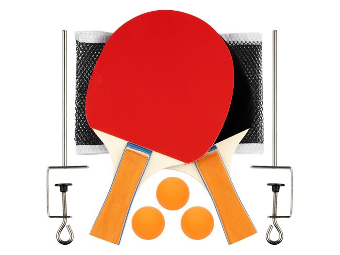 Holen Sie sich mit diesem Tischtennis-Set echtes Tischtennis-Feeling. Sie können fast jeden Tisch im Handumdrehen in eine Tischtennisplatte verwandeln. So können Sie überall Tischtennis spielen, zu Hause oder im Urlaub! Die vielseitigen Pingpong-Schläger bestehen aus sieben Holzschichten, wodurch sie besonders robust und stoßfest sind. Die Tischtennisschläger haben anatomische Griffe für guten Halt, sodass Sie während des Spiels problemlos von Vorhand auf Rückhand wechseln können. Das Schlägerblatt hat eine dicke Ober- und Unterschicht aus Gummi für gute Ballkontrolle. Die beiden Netzpfosten sind mit Klemmen mit Schraubgewinde ausgestattet, sodass Sie das Netz einfach an Ihrem Ess- oder Couchtisch anbringen und anpassen können. Die Kunststoffkappen schützen den Tisch vor Beschädigungen und halten die Netzpfosten fest an ihrem Platz. Das Set enthält 2 Tischtennisschläger, 3 nahtlose Tischtennisbälle, 2 Netzpfosten und 1 Netz.