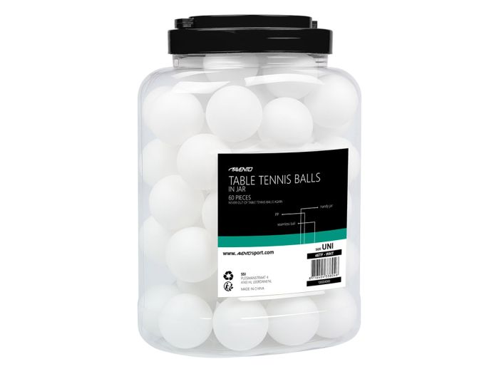 Die Avento Tischtennisbälle werden in einem durchsichtigen Kunststoff-Behälter angeboten. Inhalt 60 Stück.