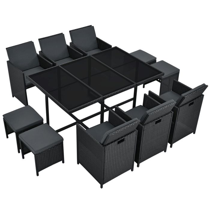 Lange, warme Sommerabende bieten die perfekte Gelegenheit für ein Zusammenkommen mit Freunden oder Familie. Unsere große 11-teilige Gartengarnitur bietet Platz für bis zu 10 Personen und überzeugt gleichzeitig mit ihrer verblüffend platzsparenden Aufbewahrungstechnik als Würfel. Die große Polyrattan Sitzgarnitur in schlichtem schwarz und grau wirkt modern und fügt sich perfekt in Ihren Garten oder auf Ihrer Terrasse ein. Die Outdoor Sitzgruppe kann sowohl als Esstisch, als auch als Lounge zum Entspannen optimal genutzt werden.