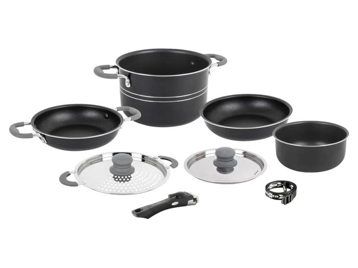 Erhöhen Sie Ihre kulinarischen Ansprüche mit dem Popote Flavor 7+1 Non-Stick Aluminium Kochgeschirr-Set, das Funktionalität, Haltbarkeit und innovatives Design kombiniert, um all Ihre Kochbedürfnisse zu erfüllen.