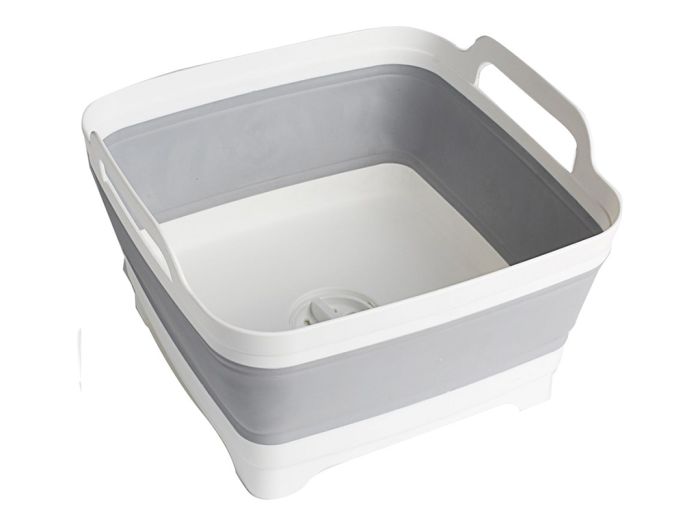 Faltbare Waschschüssel aus robustem Kunststoff mit integrierten Tragegriffen und verschliessbarem Bodenablauf. Dank Fold-Away System sehr kompakt faltbar und platzsparend transportierbar.