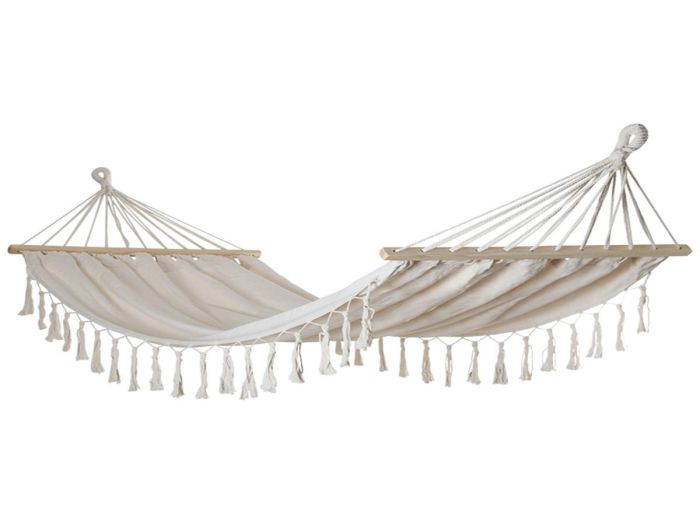 Die Buitenkado Hängematte mit Spreizstäben ist eine geräumige 420 cm lange Doppelhängematte. Mit ihrer cremeweißen Farbe und ihrer robusten Konstruktion bietet diese Hängematte einen bequemen Platz zum gemeinsamen Entspannen im Garten.