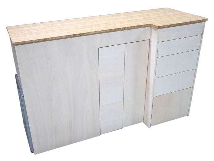 Dieser Küchenblock kann in jedem (höheren) Wohnmobil verwendet werden, er ist universell einsetzbar. Er besteht aus 15 mm starkem Pappel-Multiplex mit einer Arbeitsplatte aus Bambus. Das Material ist unbehandelt, sodass Sie es in der gewünschten Farbe/mit farblosem Lack lackieren können.
