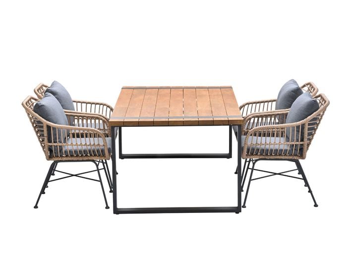 Suchen Sie ein rundes, schönes Gartenset mit einem robusten Gartentisch aus Holz? Dann schauen Sie sich dieses Lucas - Alto Gartenset 5-teilig mit Teak-Gartentisch an. Dieser Gartentisch ist mit bequemen Gartenstühlen kombiniert. Ein schönes Gartenset mit einem ländlichen, robusten Look. Der Gartenstuhl hat einen Aluminiumrahmen und das Gestell ist aus Stahl gefertigt. Das braune Flechtwerk ist von Hand um das Aluminium geflochten. Der Gartenstuhl muss bei Lieferung zusammengebaut werden. Die Beine lassen sich leicht anbringen. Der Gartenstuhl wird mit einem grau gefärbten Sitzkissen geliefert. Das Kissen ist mit einem Reißverschluss versehen, so dass der Bezug leicht mit der Hand gewaschen werden kann. Der Gartentisch Alto hat eine Tischplatte aus Teakholz. Das Gestell dieses schönen Gartentischs ist aus Aluminium gefertigt. Teakholz ist von Natur aus ein fetthaltiges Holz, was es sehr haltbar und hervorragend für den Außenbereich geeignet macht. Ohne Behandlung wird Teakholz im Freien an der Oberfläche rauer und kann mit der Zeit Haarrisse bekommen. Das tut der Qualität des Gartentischs keinen Abbruch, verleiht ihm aber ein natürliches Aussehen. Im Freien altert das Holz. Wenn Sie die ursprüngliche Farbe beibehalten möchten, ist eine zweimalige Pflege pro Jahr erforderlich. Dies können Sie ganz einfach tun, indem Sie den Gartentisch mit Teak-Reiniger & Restaurator behandeln. Nach der Reinigung und Restaurierung des Teakholzes muss das Holz wieder vor Witterungseinflüssen geschützt werden. Dies kann leicht geschehen, indem Sie das Teakholz mit Teaköl behandeln. Der Gartenstuhl hat eine Größe von 59 x 69,5 cm und ist 82,5 cm hoch. Der Gartentisch misst 180 x 100 cm und ist 75 cm hoch. Die Höhe bis zur Unterseite der Tischplatte beträgt 72 cm.