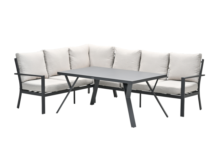 Das Senja Lounge Dining Set mit Desert Sand Kissen. Dieses Lounge-Ess-Set ist aus hochwertigem Aluminium gefertigt und verfügt über robuste Kissen in der Farbe Desert Sand sowie eine hohe Rückenlehne für ultimativen Komfort beim Entspannen. Das Besondere an diesem Set ist, dass der hohe Tisch die Möglichkeit bietet, darauf zu speisen. Das wartungsfreie und witterungsbeständige Aluminium ist mit einer langlebigen dunkelgrauen Pulverbeschichtung versehen. Aluminium ist im Allgemeinen wartungsarm. Sollte das Set jedoch beispielsweise durch Regenwasser verschmutzt sein, können Sie es ganz einfach mit grüner Seife und einem weichen Tuch reinigen. Dadurch ist es ideal für den täglichen Gebrauch geeignet. Dieses Lounge-Essset kann auch mit einem Lounge-Esszimmerstuhl und einer Sportbank erweitert werden. Der Tisch verfügt über eine stilvolle Lattenstruktur und breite, flache Tischbeine, die für ein schlichtes Design sorgen. Darüber hinaus sind die Beinkappen verstellbar, sodass das Set leicht nivelliert werden kann. Die mitgelieferten dicken Kissen in der Farbe „Desert Sand“ bestehen aus hochwertigem Polyester und verfügen über Reißverschlüsse, sodass die Bezüge leicht von Hand waschbar sind. Obwohl die Kissen nicht vollständig wasserbeständig sind, sind sie mit einer wasserabweisenden Beschichtung versehen. Dies ist besonders nützlich, wenn etwas verschüttet wird; Sie können die Feuchtigkeit leicht abwischen. Nach Gebrauch können die Kissen im Schuppen oder in einer Kissenbox aufbewahrt werden. Diese Lounge-Essgruppe besteht aus zwei Sofas für drei Personen und einem Lounge-Esstisch. Möchten Sie die Lounge-Essgruppe Senja um zusätzliche Sitzplätze erweitern? Dies ist mit dem Senja Lounge Chair oder der Sportbank der renommierten Marke Garden Impressions möglich. Dadurch können Sie zusätzlichen Platz für Gäste schaffen. Darüber hinaus ist die Lounge-Essgruppe sowohl in einer rechten als auch einer linken Konfiguration erhältlich.