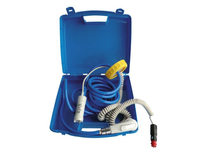 Die mobile Spiral Dusche Comet wird mit einer praktischen Tasche geliefert. Die mitgelieferte Tauchpumpe wird mit 12 Volt betrieben und hat eine Kabellänge von ca. 4 Metern. Darüber hinaus hat die Tauchpumpe Eco einen Druck von 0,6 bar und verbraucht 18 - 24 Watt. Die Handbrause ist verstellbar und mit einer Schlauchlänge von ca. 2 Metern ausgestattet.