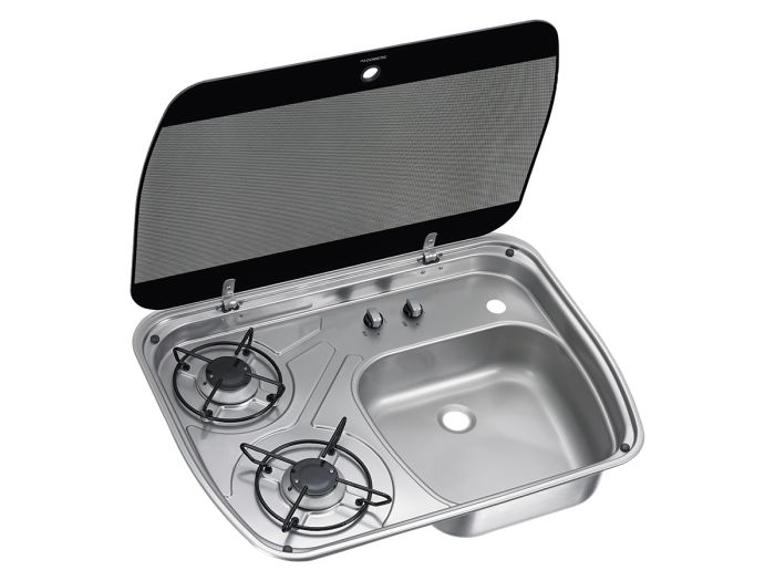 Die Dometic HSG2445 Kochfeld-/Spülekombination ist eine kompakte 2-flammige Kochfeld-/Spülekombination mit einer hitzebeständigen Glasabdeckung für Kücheneinrichtungen mit kleinen Räumlichkeiten in z.B Ihrem Wohnwagen, Wohnmobil oder Boot.