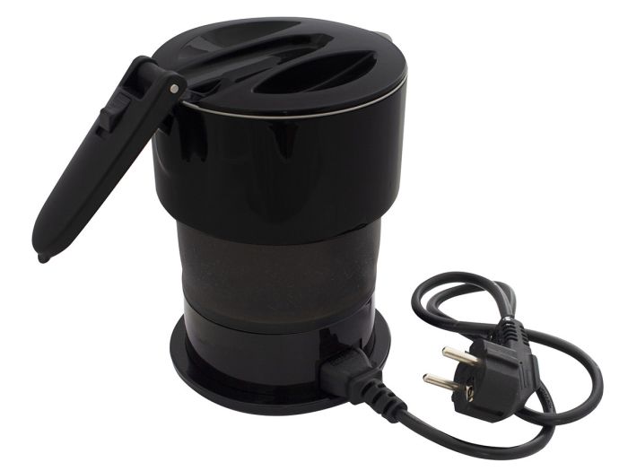 Dank seines cleveren Designs nimmt er kaum Platz weg. Ideal für kleine Küchen, Wohnwagen, Wohnmobile oder einfach in Ihrer Wochenendtasche. Ausgeklappt bietet er ein großzügiges Fassungsvermögen von 0,6 Litern, perfekt für eine schnelle Tasse Tee oder Kaffee.