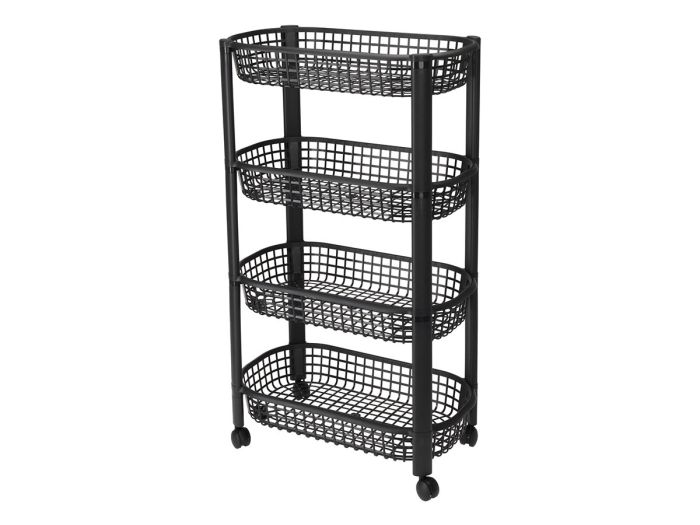Dieser Wagen hat ein kompaktes vierstöckiges Design mit geräumigen Körben, sodass Sie Gewürze, Kochutensilien, Geschirr oder andere Küchenutensilien einfach organisieren können, ohne viel Platz auf dem Boden zu beanspruchen.