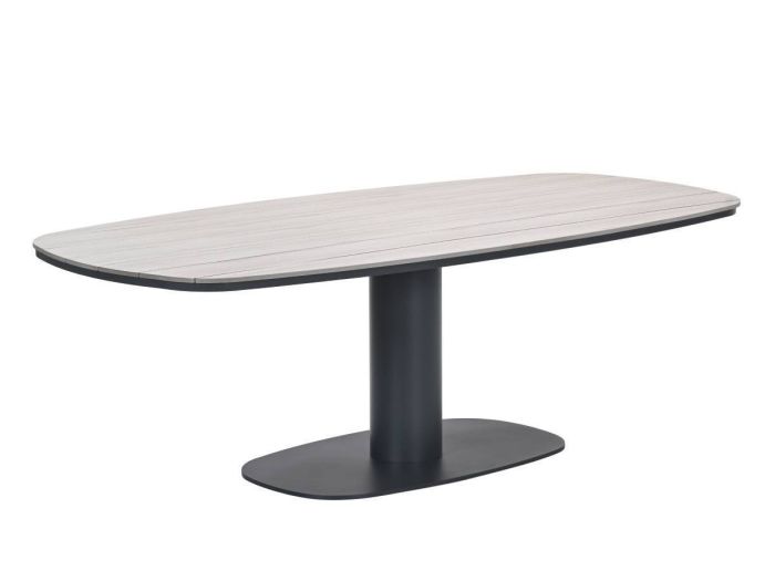 Dieser Gartentisch wurde mit einem stabilen Aluminiumgestell mit hochwertiger Pulverbeschichtung entworfen, wodurch er stabil, rostfrei und pflegeleicht bleibt. Die Polywood-Tischplatte ist farbecht, wetterbeständig und leicht zu reinigen. Das elegante Untergestell im Drum-Stil verleiht dem Tisch ein modernes, raffiniertes Aussehen, während die ovale Form mit weichen Linien der Tischplatte für einen stilvollen und einladenden Look sorgt. Mit seinen großzügigen Abmessungen von 230 x 110 x 72 cm bietet der Newton reichlich Platz für große Gesellschaften. Der Tisch ist vollständig für den Außenbereich geeignet. Um Feuchtigkeitsschäden zu vermeiden, sollten Sie den Tisch nicht mit einer Abdeckung abdecken. Möchten Sie ihn dennoch abdecken? Achten Sie dann darauf, dass die Abdeckung nicht auf der Tischplatte liegt, die Tischplatte immer atmen kann und kein Wasser auf der Abdeckung stehen bleibt. Verwenden Sie dazu beispielsweise einen Bobbin.