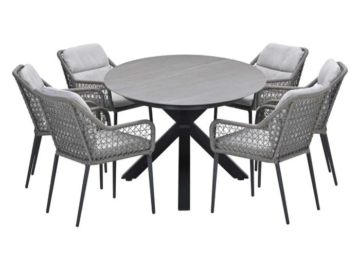 Dieses schöne Gartenset besteht aus einem Gartentisch mit Centostone-Tischplatte und sechs bequemen Gartenstühlen. Der Gartentisch ist wartungsarm und die Gartenstühle werden mit wasserabweisenden Kissen geliefert. Eine schöne Gartenanlage, in der Sie speisen und entspannen können.