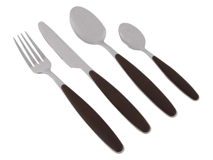 Ein stilvolles Besteckset aus rostfreiem Stahl. Das Besteck hat eine trendige braune Farbe. Mit einem Soft-Touch-Griff, so dass das Besteck bequem in der Hand liegt. Das Set besteht aus 4x Messer, Gabel, Löffel und Teelöffel und ist auch spülmaschinenfest. Passend zu dem Melamingeschirr von Gimex. Abmessungen: Gabel 21,5 cm, Messer 23 cm, Löffel 21 cm, Teelöffel 15 cm.
