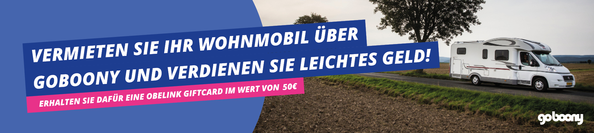 Wenn Sie Ihr Wohnmobil jetzt bei Goboony anmelden, erhalten Sie für kurze Zeit eine Obelink-Giftcard im Wert von 50 Euro! Campingurlaub ist derzeit voll im Trend, also können Sie schon innerhalb von 24 Stunden mit den ersten Mietanfragen rechnen. Vermieten Sie Ihr Wohnmobil an andere Campingbegeisterte und verdienen Sie pro Woche bis zu 900 Euro!