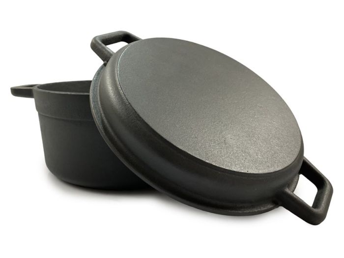 Der Deckel dieses Dutch Oven kann auch als Bratpfanne verwendet werden und ist gebrauchsfertig.