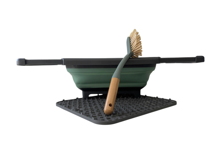 Das Set enthält eine faltbare Spülschüssel (8 Liter) mit integriertem Stöpsel und Griffen, eine Bambus-Spülbürste sowie eine graue Silikon-Abtropfmatte (29,5 x 26 cm).