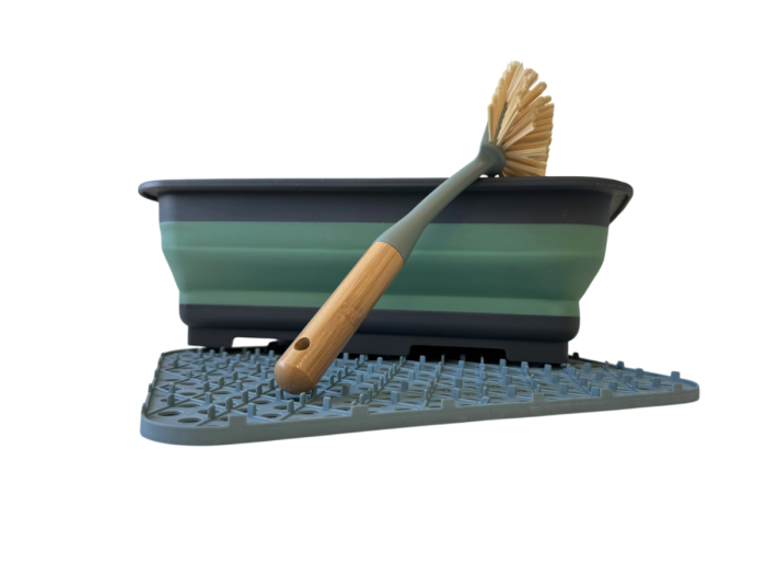 Das Set enthält eine faltbare Spülschüssel (8 Liter) mit Griffen, eine Bambus-Spülbürste und eine Silikon-Abtropfmatte (29,5 x 26 cm).