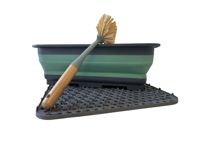 Das Set enthält eine faltbare Spülschüssel (8 Liter) mit Griffen, eine Bambus-Spülbürste und eine Silikon-Abtropfmatte (29,5 x 26 cm).