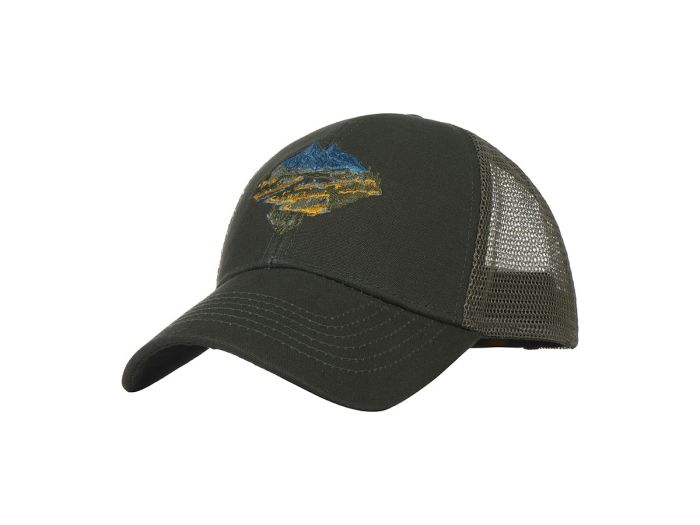 Die Truckerkappe hat eine hohe Front aus Baumwolle, während der Rest aus recyceltem Polyester besteht. Die Kappe hat einen Aufdruck auf der Vorderseite und die Größe kann leicht mit einer Schnalle auf der Rückseite eingestellt werden.