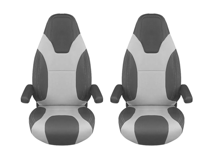 Paar Bezüge für Wohnmobile und Wohnwagen auf der Basis des Ducato Captain Sitz. Es handelt sich um einen exklusiv für dieses Sitzmodell maßgefertigten Bezug mit hervorragender Verarbeitung, ohne das Aussehen des Originalsitzes zu verändern. Die viskoelastische Kopfstütze und die spezielle Polsterung an der Basis des Sitzes machen Ihre Fahrten noch angenehmer.