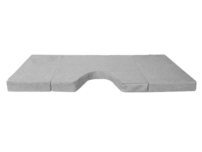 Faltmatratze für Wohnmobile, bestehend aus 7 cm HR-Schaumstoff mit 25 kg/m3 und festem Raumgewicht und einer 1 cm dicken MDF-Platte als Unterlage, um die Trennung zwischen den Sitzen zu unterstützen und so das Bett zu ebnen.