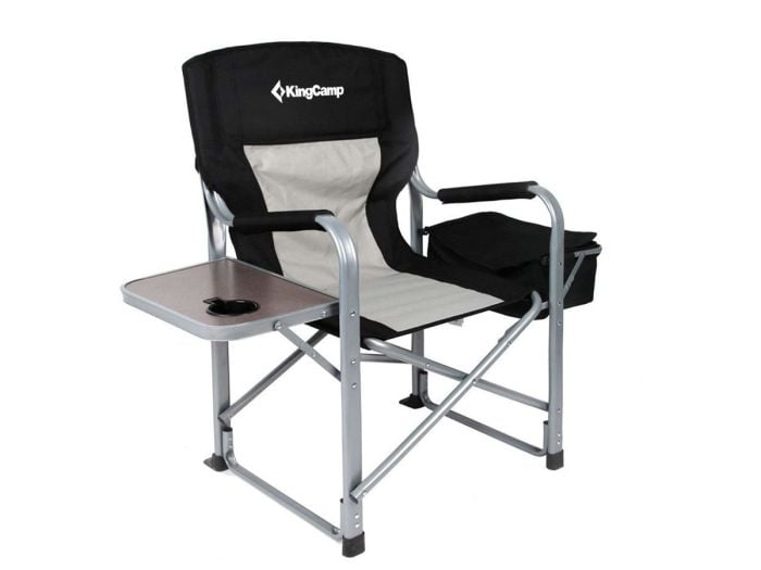 Der praktische Seitentisch ist unterhalb der Armlehne befestigt und lässt sich auf Wunsch einklappen. Er eignet sich ideal für Handys und dank des integrierten Becherhalters auch für Getränke aller Art. An der zweiten Lehne ist zudem eine Kühltasche mit Reißverschluss montiert, die sich ebenfalls einklappen lässt und für jederzeit verfügbare, kalte Getränke sorgt.