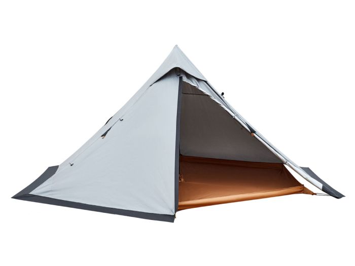 Das Zelt verfügt über eine Bodenplane aus PU-beschichtetem 150D Oxford-Polyester und ein silberbeschichtetes Obermaterial aus 150D Oxford-Polyester. Es schützt zuverlässig vor UV-Strahlen Wind, Regen und Schnee und erlaubt zusammen mit dem im Lieferumfang enthaltenen Schornsteinausgang die Benutzung eines Zeltofens, mit dem sich das Zelt im Winter auf eine angenehme Temperatur heizen lässt. Die Kegelform mit abschüssigen Außenwänden verhindert zudem die Ansammlung von Schnee auf der Zeltplane.