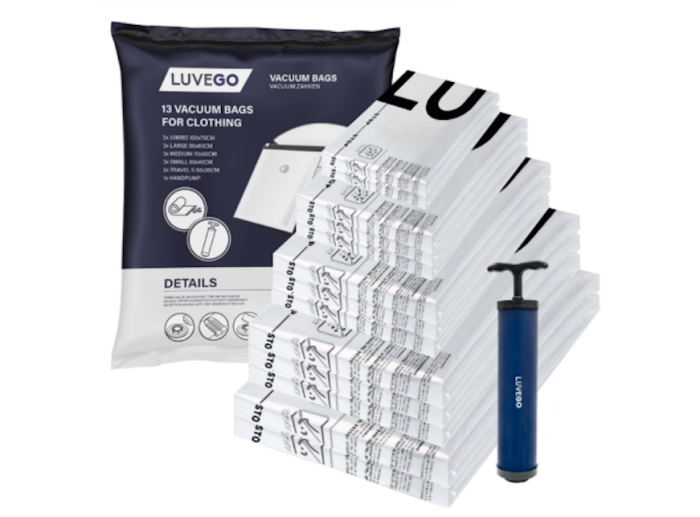Mit den LUVEGO Vakuumbeuteln sparen Sie eine Menge Platz. Ob Sie nun Platz in Ihrem Koffer sparen, mehr Platz in Ihrem Kleiderschrank schaffen oder die riesigen Stofftiere Ihrer Kinder aufbewahren wollen, die Vakuumbeutel von LUVEGA sind die Lösung. Dieses 13-teilige Vakuum-Aufbewahrungsbeutel-Set besteht aus 1 Vakuumpumpe, 6 Medium, 5 XL, 2 Jumbo Vakuumbeuteln. Sie können die Jumbo-Beutel zum Beispiel dazu verwenden eine Bettdecke, große Kissen oder eine ganze Menge Kleidung zu verstauen!