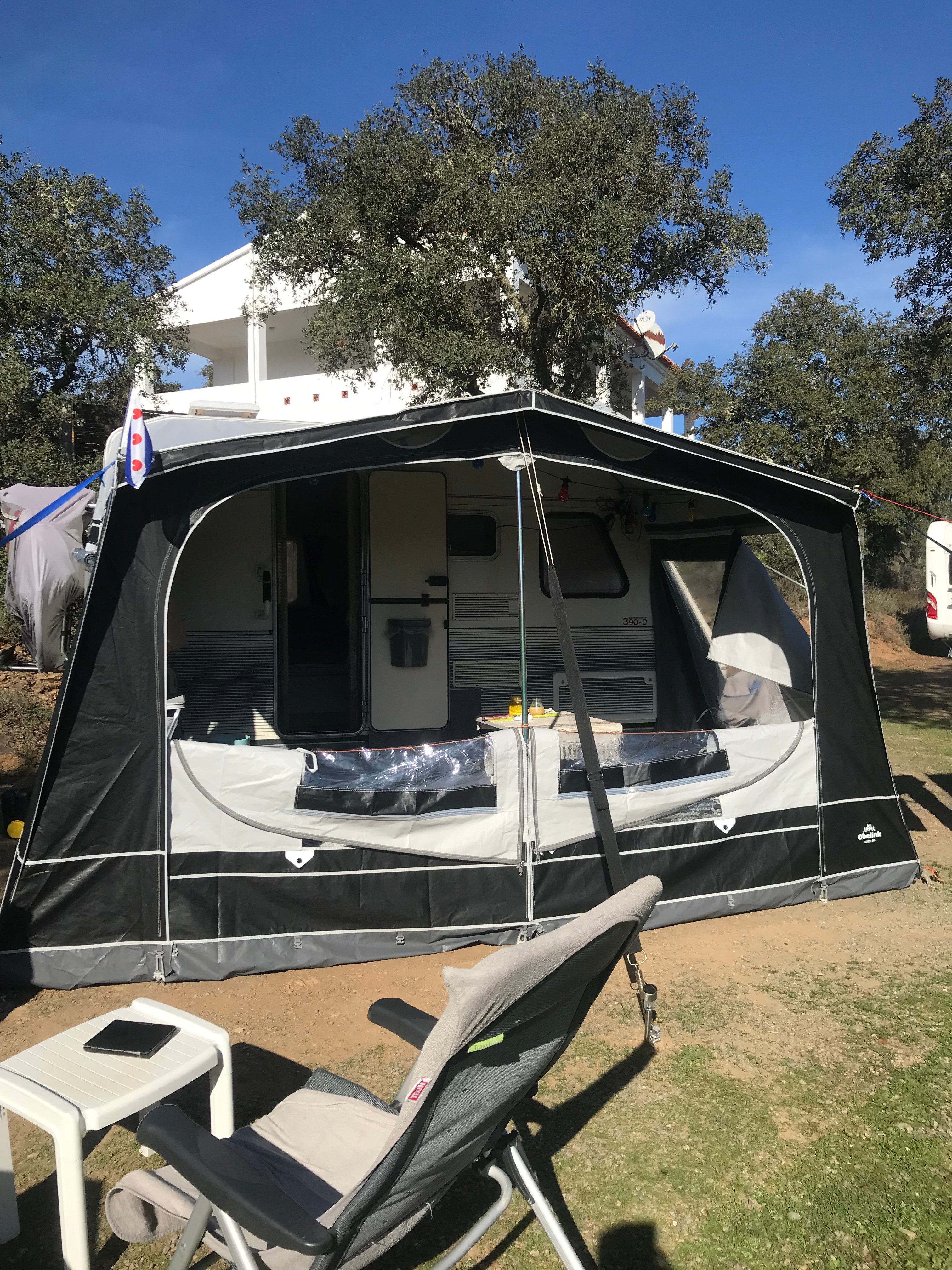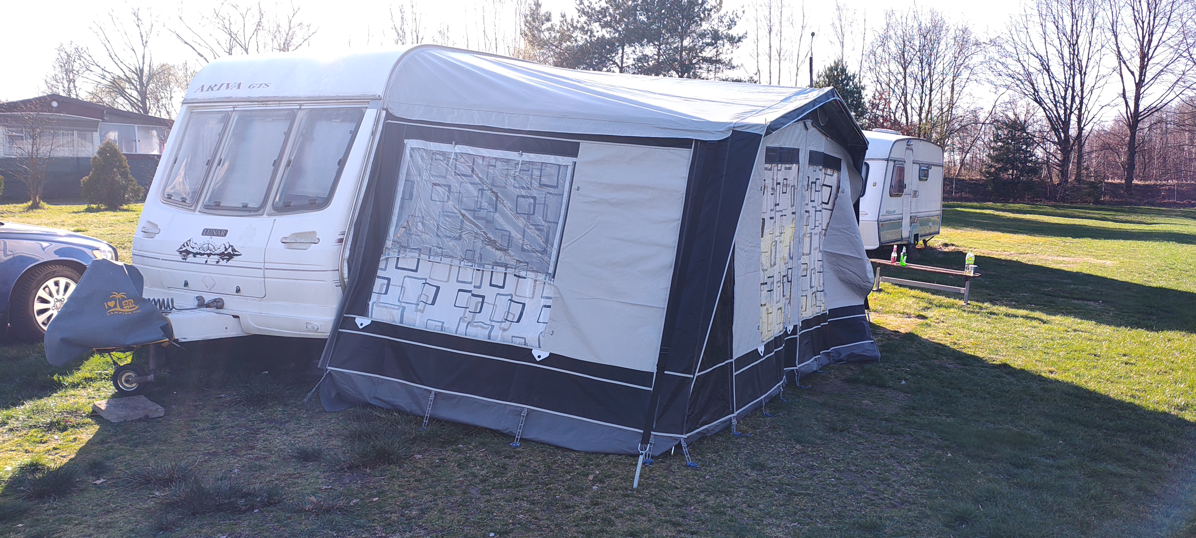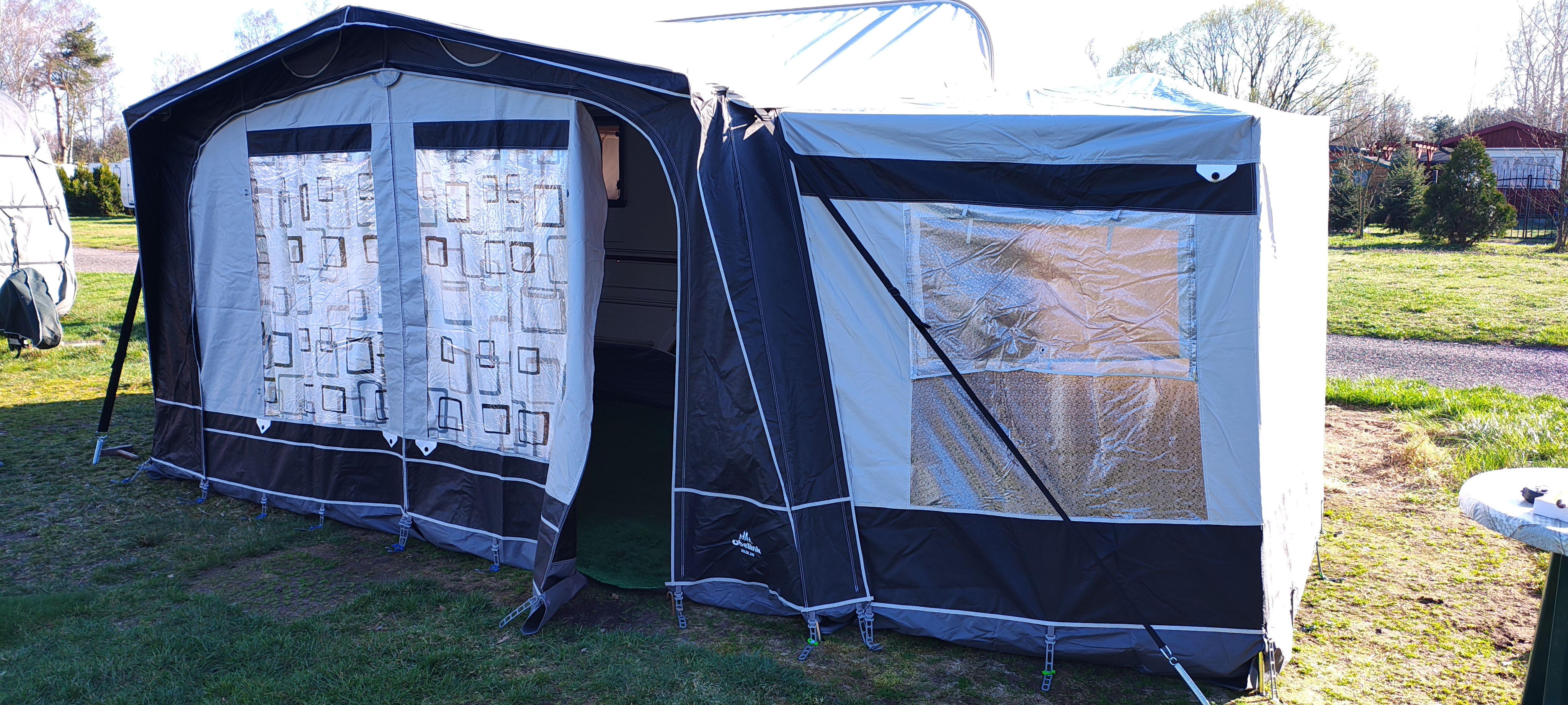 Ein Dachüberstand, der bei den meisten traditionellen Wohnwagenvorzelten erhalten ist.