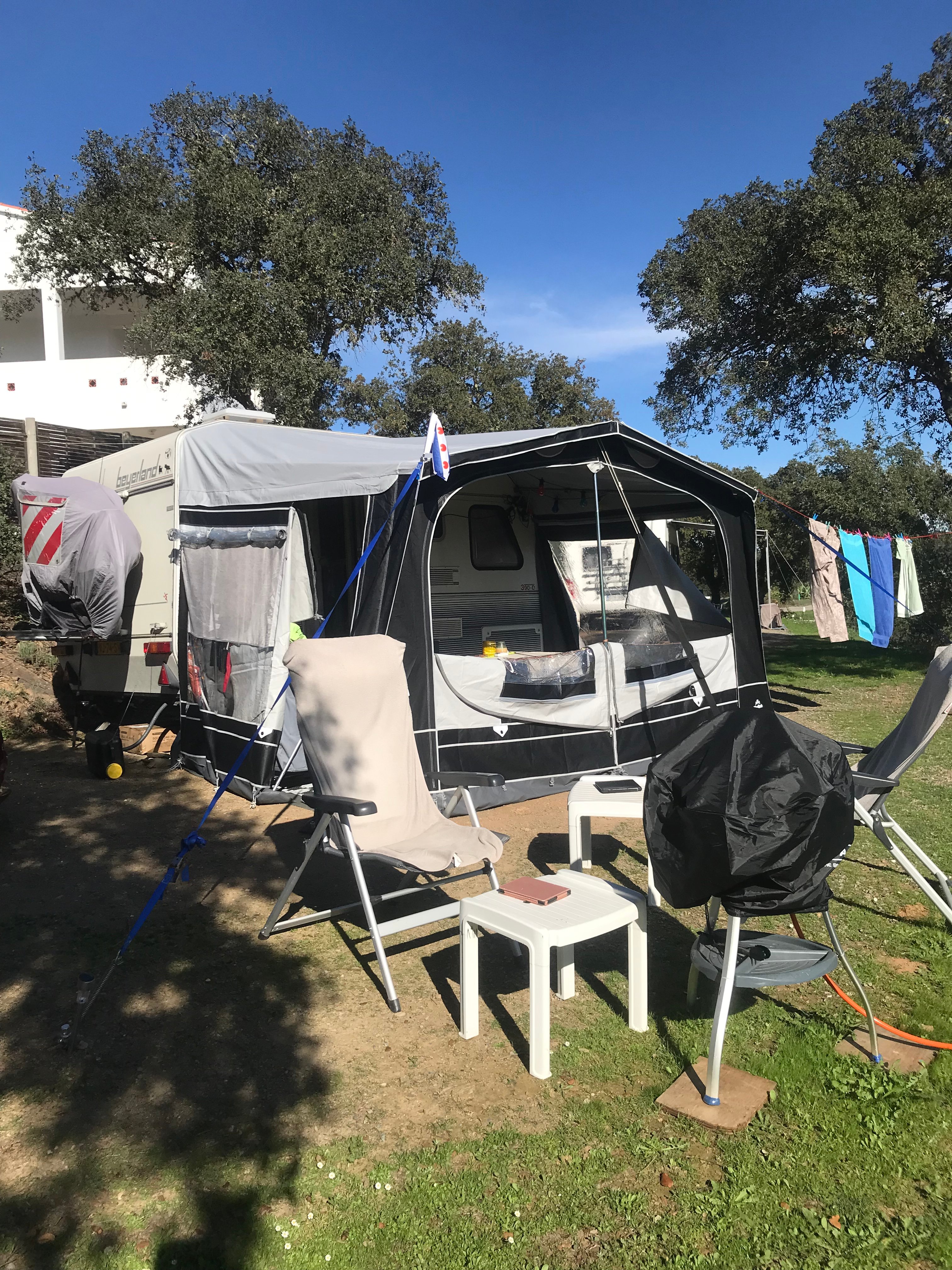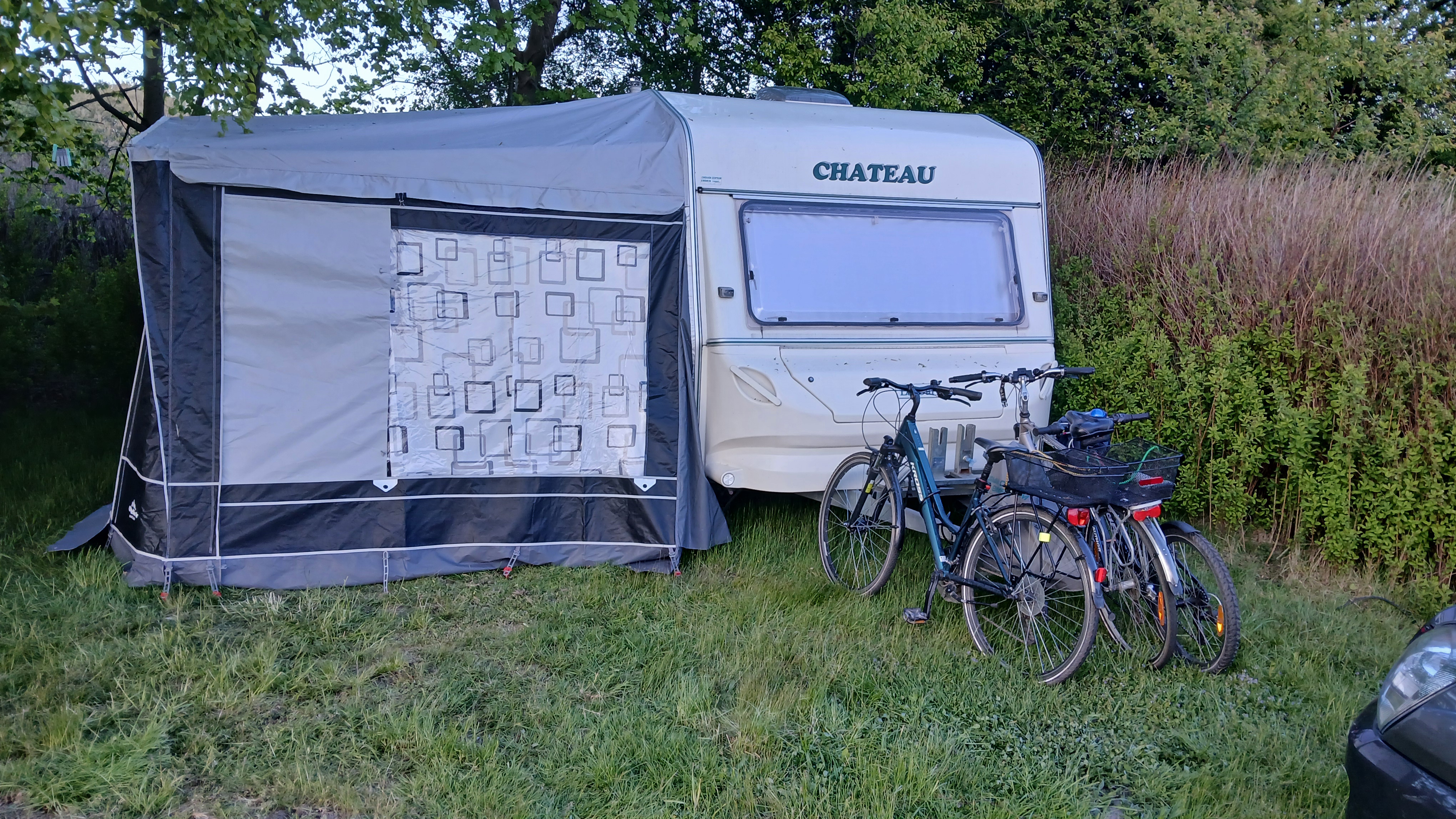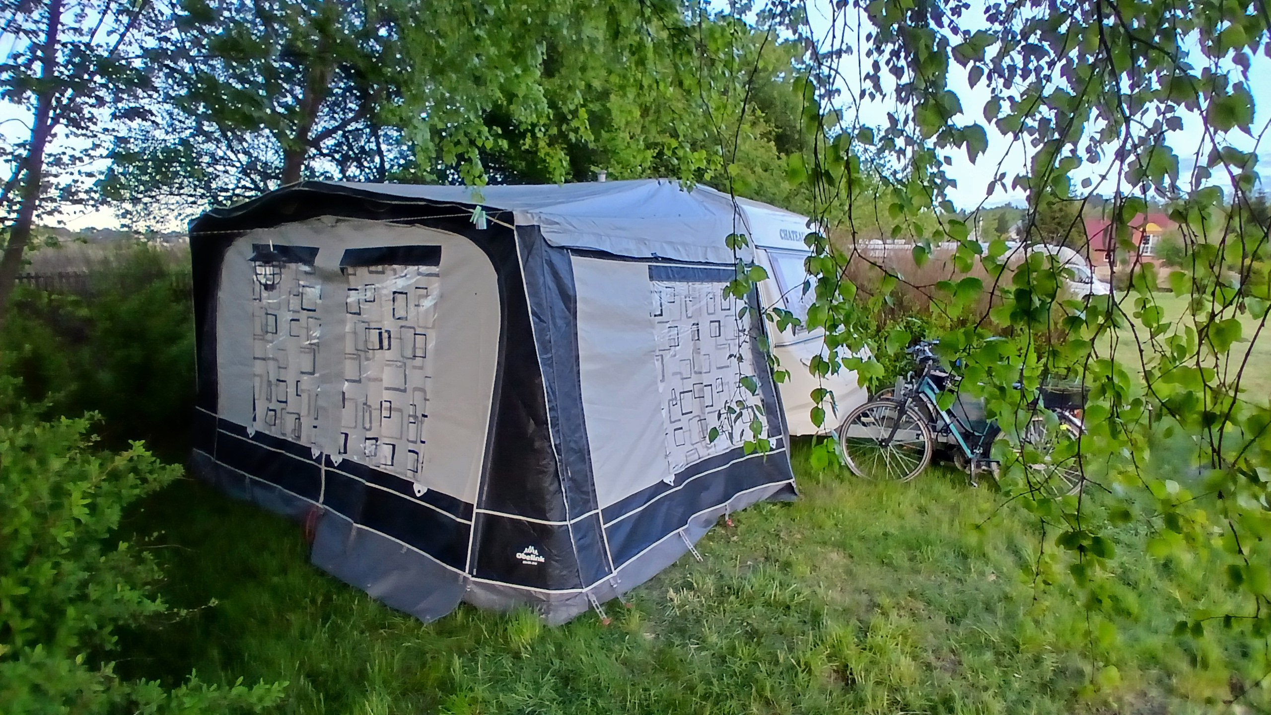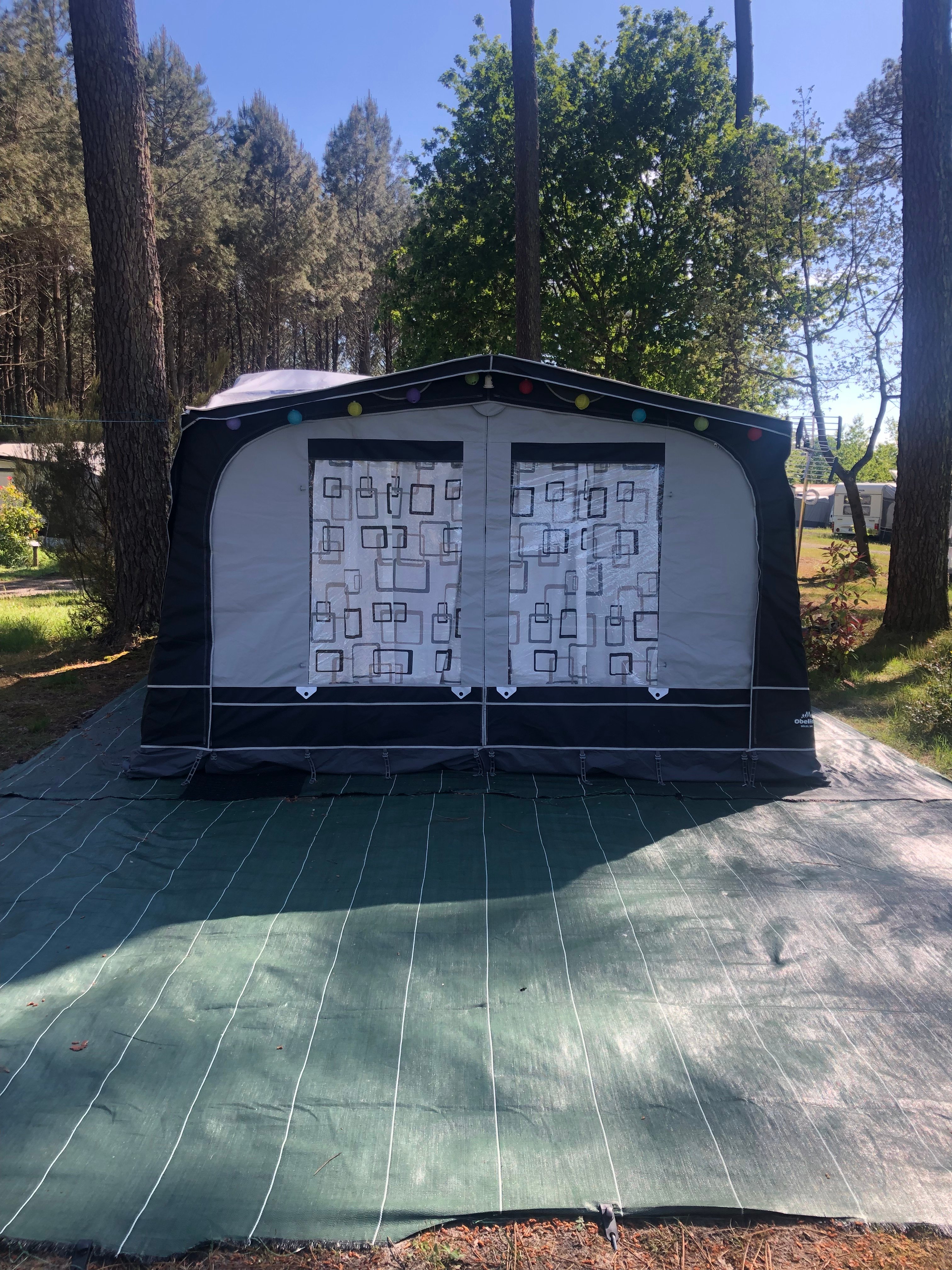 Ein Dachüberstand, der bei den meisten traditionellen Wohnwagenvorzelten erhalten ist.