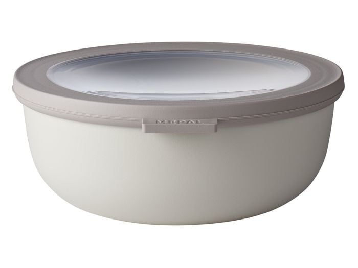 Multischüssel Cirqula 1250 ml in der Farbe Nordic white. Diese weiße Schüssel mit einem Inhalt von 1,25 l ist ideal für das Aufbewahren und den Transport von größeren Portionen Suppe, Fleischgerichten oder Salaten. Die Cirqula Serie von Mepal wurde speziell für einen vollständigen ‚Circle of Use‘ entwickelt. Vom Aufbewahren von Mahlzeiten im Kühl- oder Gefrierschrank, dem Erwärmen in der Mikrowelle (ohne Deckel) und dem Servieren (direkt) auf den Tisch. Die Cirqula besteht aus unzerbrechlichem Material und das Sichtfenster im Deckel zeigt immer den Inhalt der Schüssel. Der innovative glatte Deckel ist zudem luftdicht und auslaufsicher. Das Essen bleibt daher länger frisch, kann perfekt aufbewahrt und transportiert werden. Die Mepal Cirqula Schüsseln sind praktisch und einfach zu verstauen, lassen sich mit Deckel ordentlich übereinander oder platzsparend ineinander stapeln.
