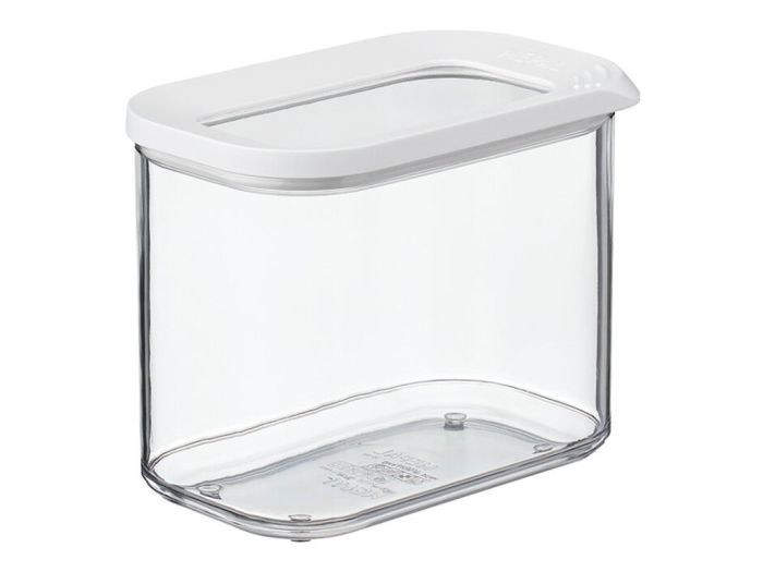 Vorratsdose Modula 1000 ml, mit einem durchsichtigen Deckel mit weißem Ring. Diese rechteckige Dose von Mepal mit abgerundeten Ecken hat ein Inhalts-Volumen von 1 l und ermöglicht einen direkten Blick auf den Inhalt. Der transparente Deckel mit weißem Rand und Dichtungsring sorgt für einen perfekten Verschluss, wodurch diese Vorratsdose ideal geeignet ist für die Aufbewahrung von trockenen Lebensmitteln wie z.B. Kaffeebohnen, Nudeln, Plätzchen oder Mehl. Die Modula Vorrats- und Aufbewahrungsdosen sind in verschiedenen Größen und Ausführungen erhältlich, liegen gut in der Hand und sind leicht zu öffnen. Desweiteren sind die Dosen stapelbar und spülmaschinengeeignet.