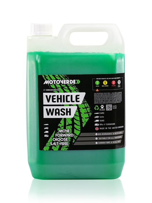 Motoverde Vehicle Wash 5 Liter: Der einzigartige Reinigungseffekt wird u. a. durch die aufschäumende und haftende Wirkung erzielt. Im Gegensatz zu vielen anderen Wohnmobilreinigern enthält Motoverde keine aggressiven oder ätzenden Stoffe wie Natriumhydroxyd oder Lösungsmittel die bei der Herstellung vieler Reiniger verwendet werden. Auch auf ätzende Lösungsmittel, wie sie bei anderen Reinigern zum Einsatz kommen, wurde komplett verzichtet. Motoverde kann bedenkenlos auf allen Materialien, egal ob Aluminium, Kunststoff, Gummi, Dekorkits oder Carbon- und Kohlefaserteilen aufgebracht werden. Je länger die Einweichzeit, umso besser der Reinigungseffekt. Sprühen Sie ihr Bike ein und lassen sie Motoverde bis zu 10 Minuten einwirken. Schmutz, Öle und andere Rückstände – alles lässt sich einfach mit Wasser abwaschen. Sofort nach dem Abwaschen