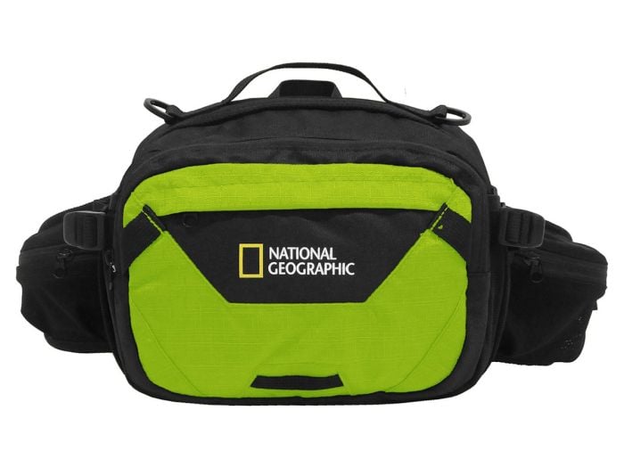 Eine sportliche National Geographic Hüfttasche aus der Destination-Kollektion mit einem Hauptfach, einer Vordertasche und einem Reißverschlussfach auf der Rückseite. Im Hauptfach ein RFID-Fach und ein paar weitere Fächer. Ein gut verstellbarer Hüftgurt, der mit einer Schnalle geschlossen wird. Maße: 34 x 10,5 x 16 cm