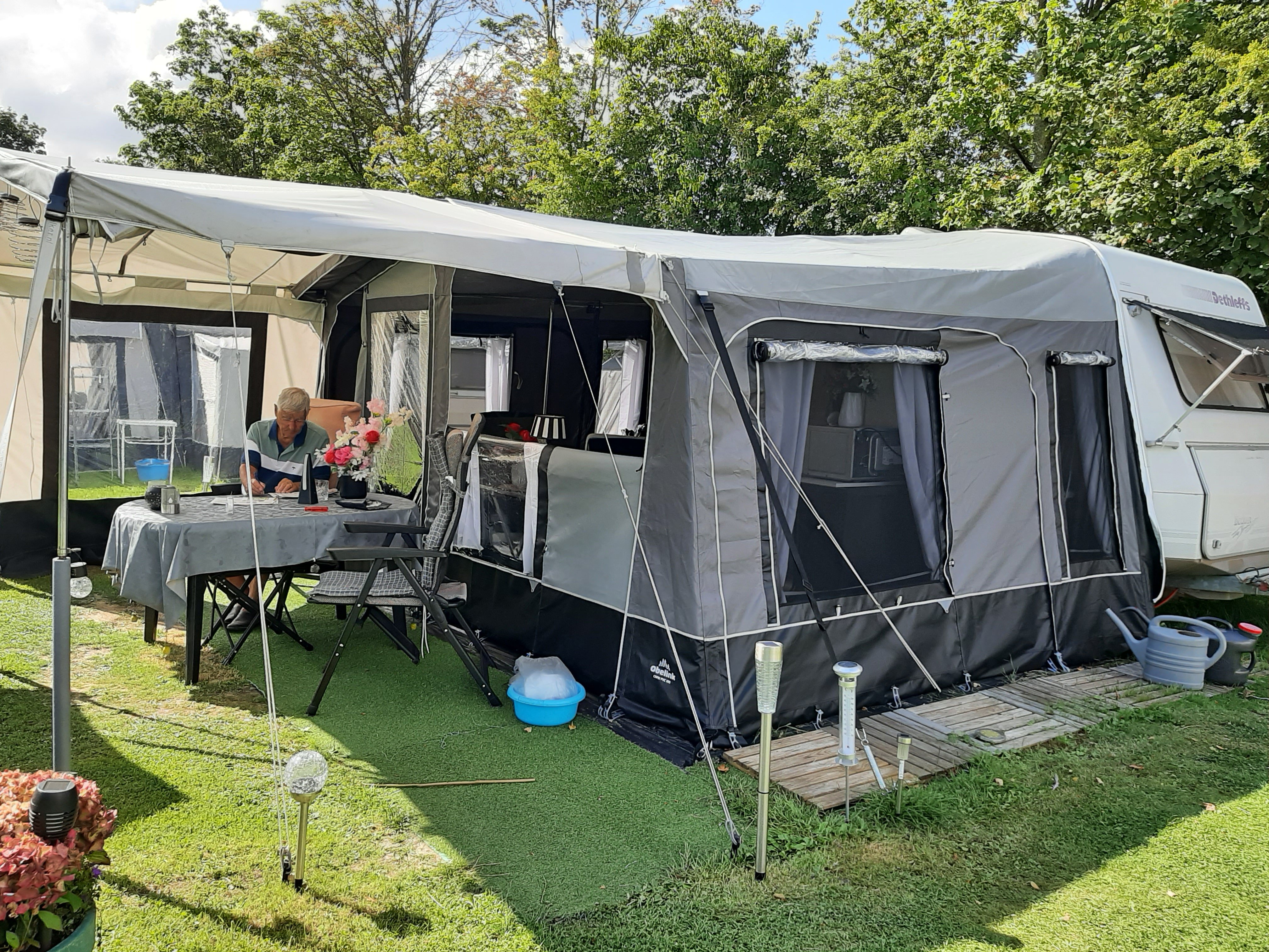 Ein Dachüberstand, der bei den meisten traditionellen Wohnwagenvorzelten erhalten ist.