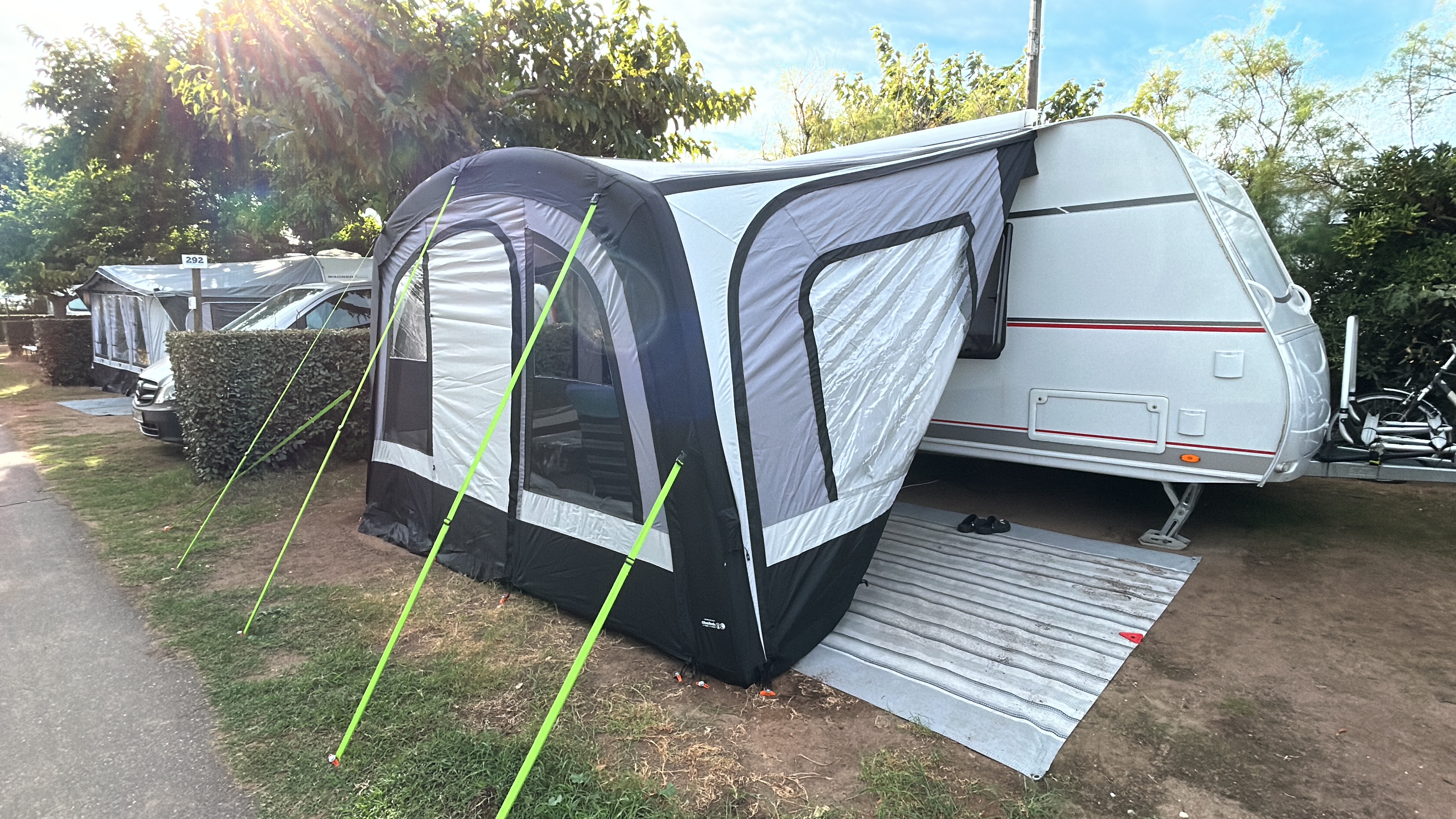 Dieses (Vor-)Zelt oder diese Markise ist mit aufblasbaren Luftschläuchen anstelle von Zeltstangen ausgestattet