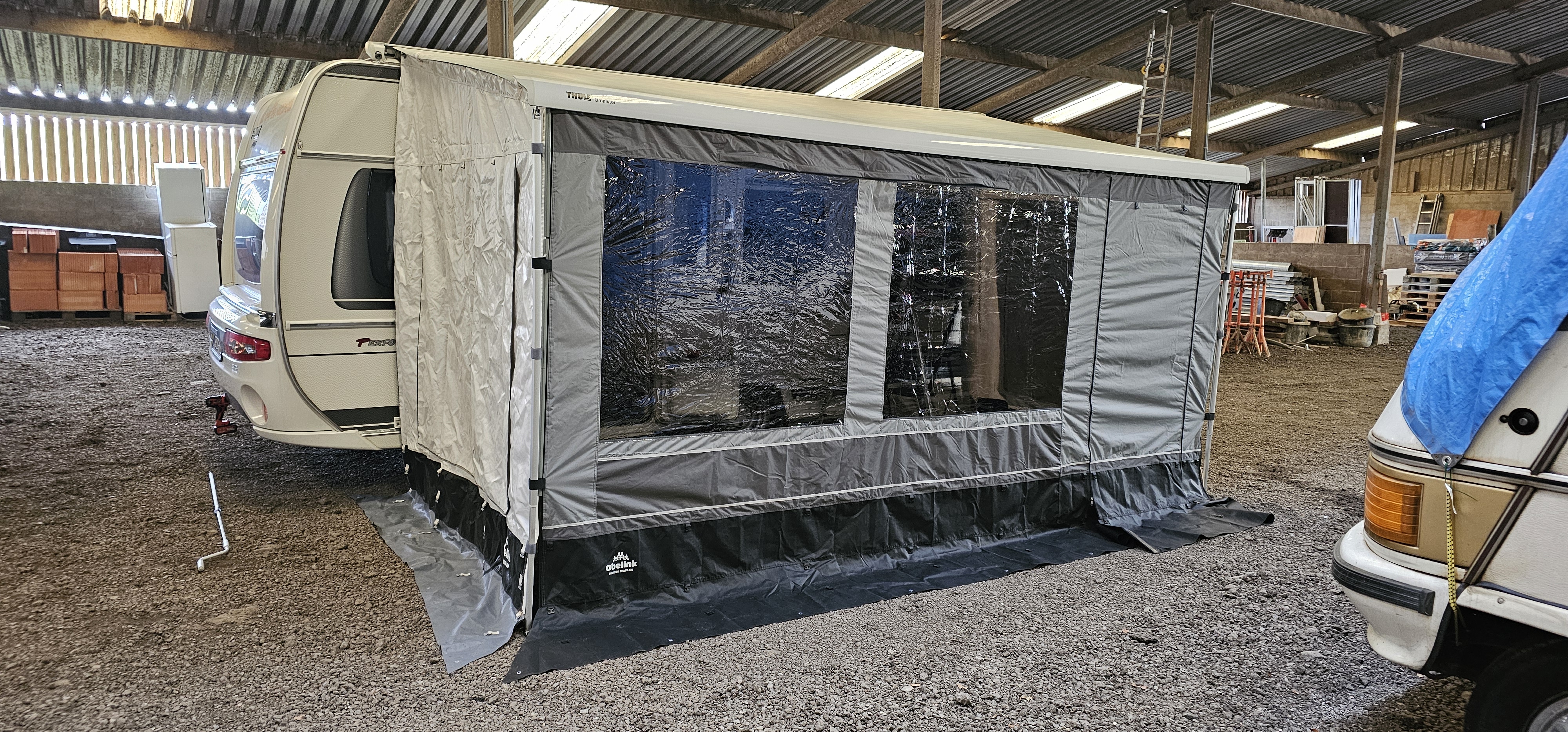 Die Vorderwand ist an den Seiten mit Klettverschlüssen zur Befestigung an den Markisenstangen ausgestattet. In Kombination mit den Emperor Seitenwänden ist es möglich, die Markise in ein komplettes Vorzelt zu verwandeln.