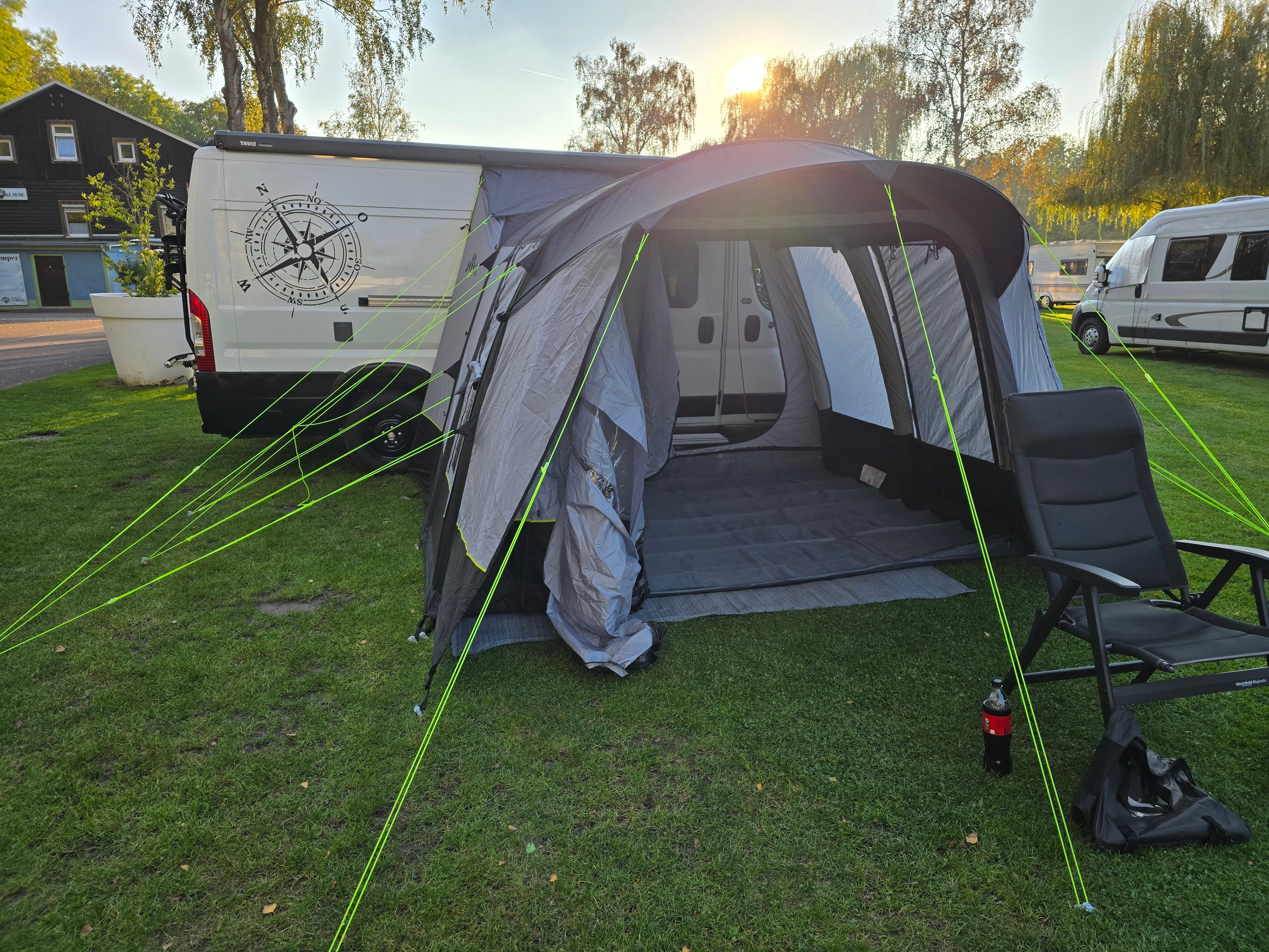 Der (überdachte) Raum zwischen dem Zelt und dem Fahrzeug.