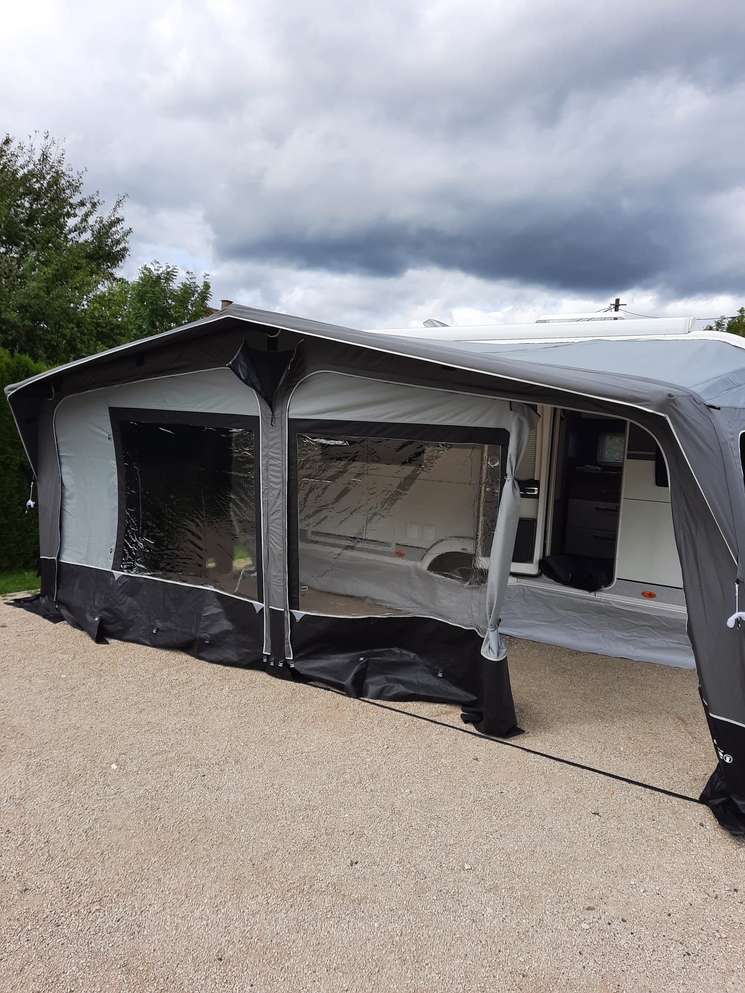 Ein Dachüberstand, der bei den meisten traditionellen Wohnwagenvorzelten erhalten ist.