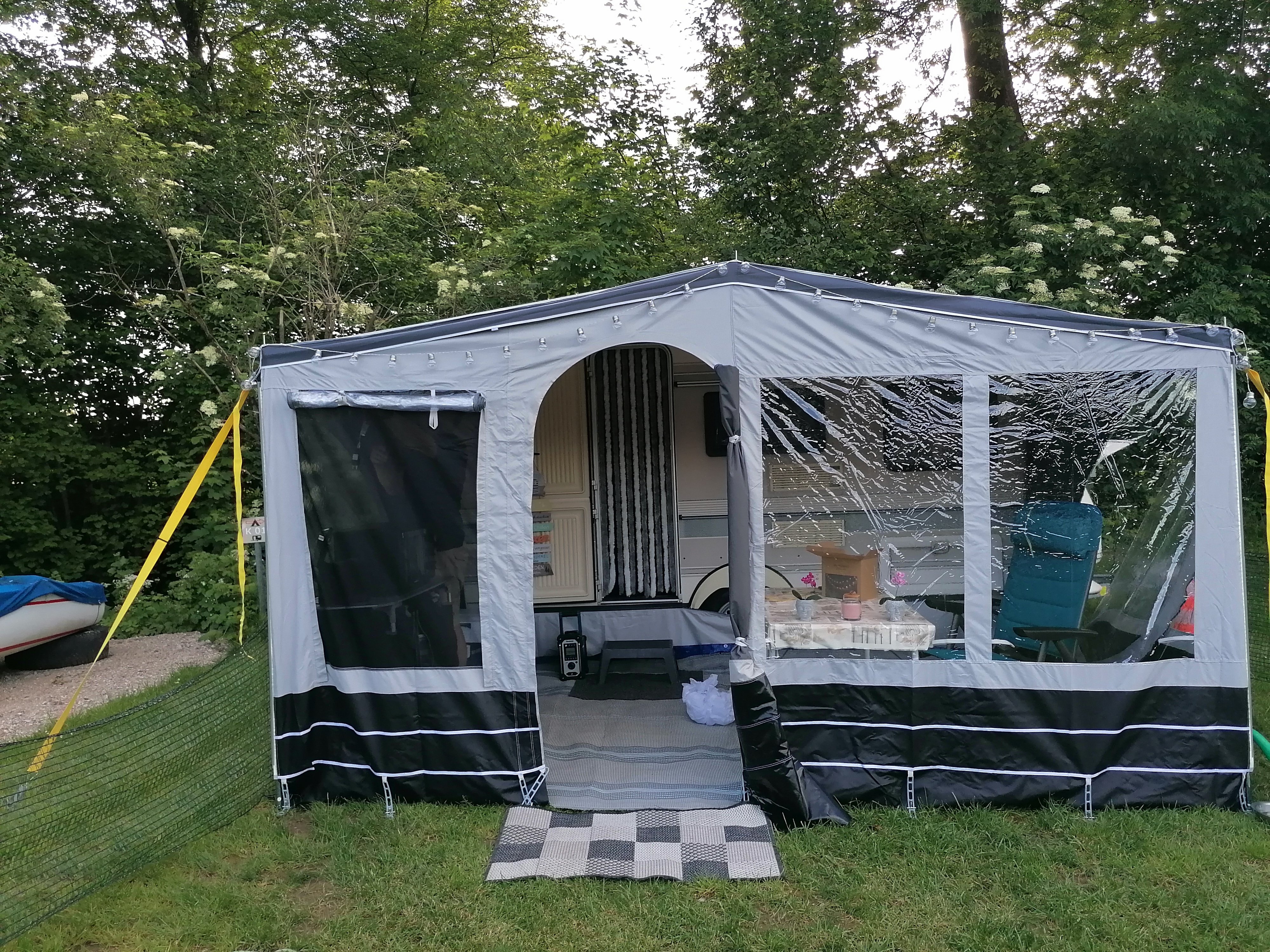 Die Vorderwand lässt sich mit den mitgelieferten Doppel-Kederschienen und Klettverschlüssen einfach an das Sonnenvordach anbringen. Die Vorderwand hat ein Fenster aus Netzgewebe mit Folienabdeckung und eine Tür in der linken Wand. Die rechte Wand hat große Fenster.