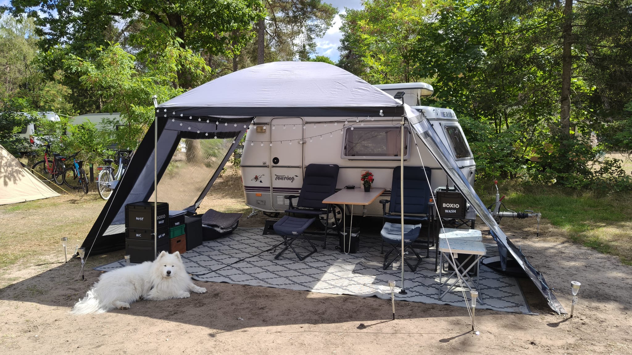 Ein freistehendes Zelt kann auch ohne Wohnmobil oder Bus an Ort und Stelle bleiben. Das ist besonders praktisch, wenn man öfters mit dem Fahrzeug losziehen will, ohne jedesmal das Zelt auf- und abbauen zu müssen.