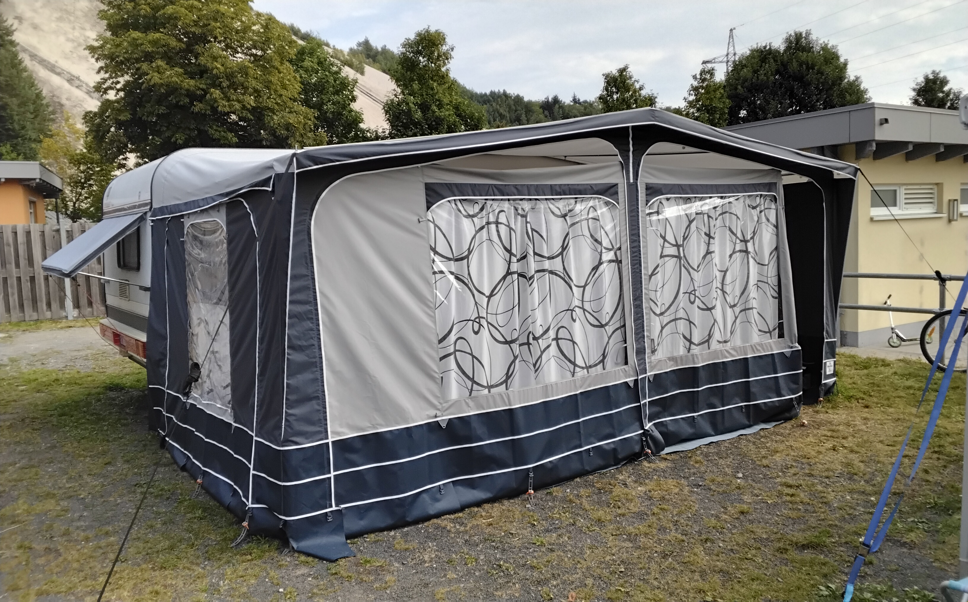 Ein Dachüberstand, der bei den meisten traditionellen Wohnwagenvorzelten erhalten ist.