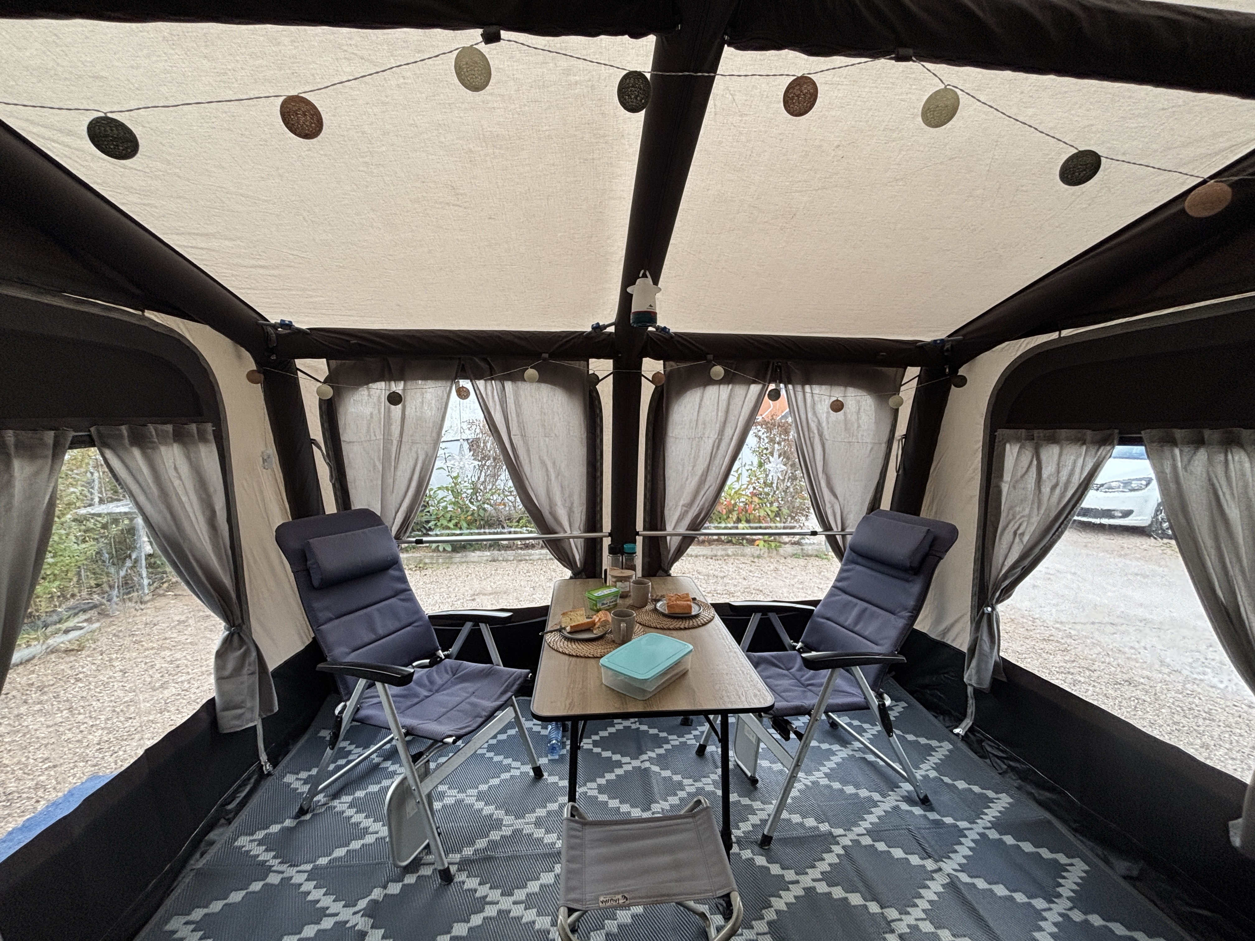 Die linke Seitenwand, wenn man das Zelt von vorne betrachtet.