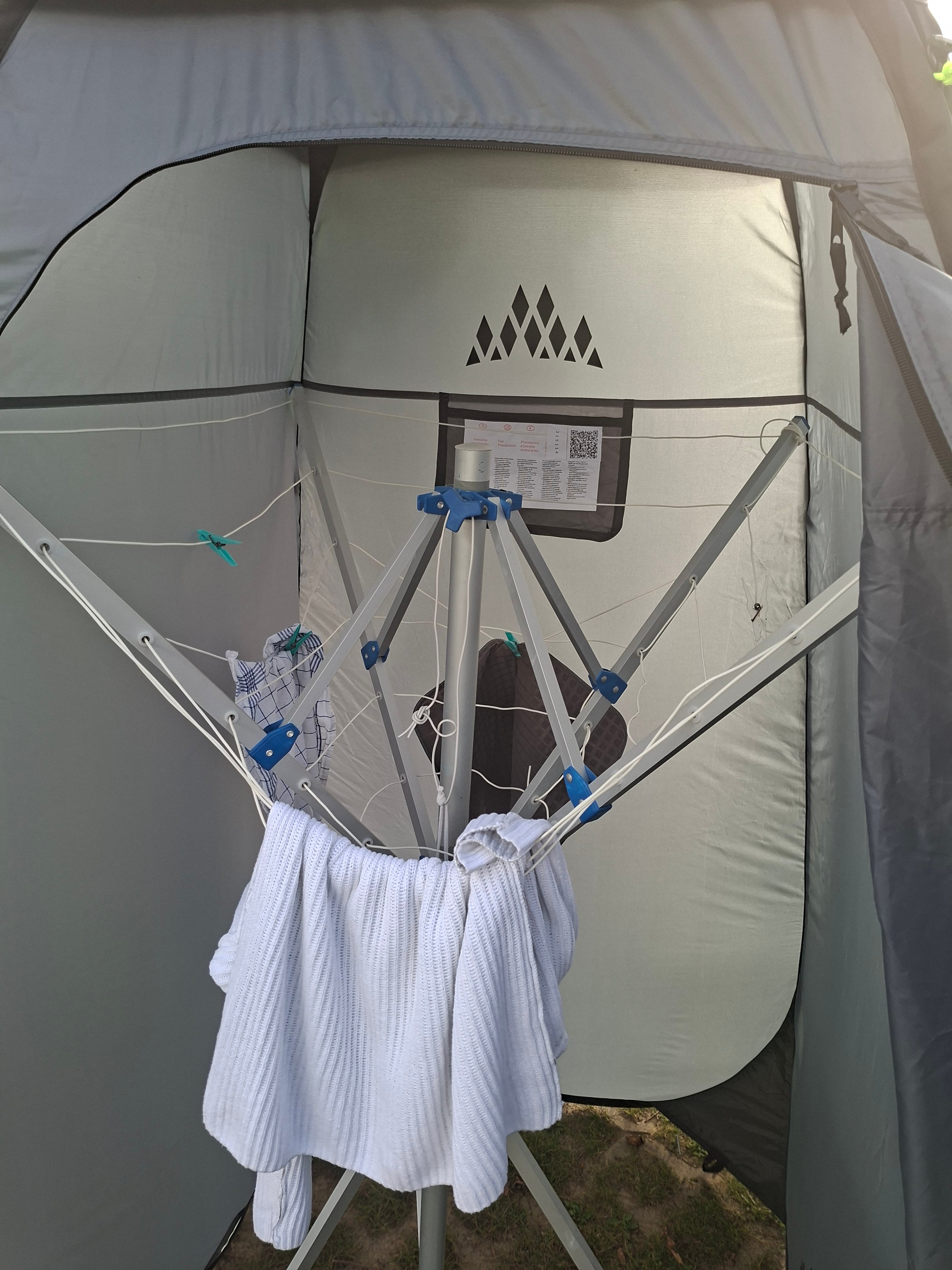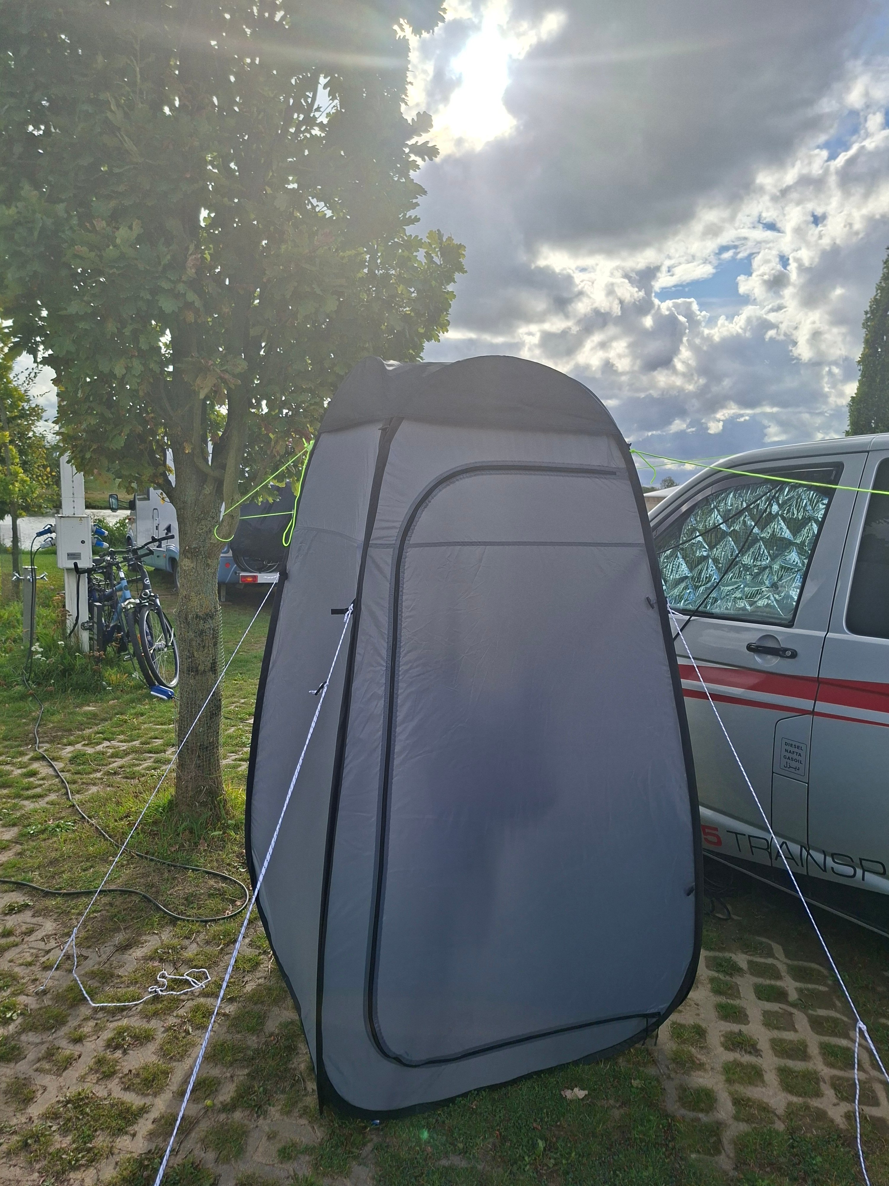 Vielleicht weniger wichtig, wenn Sie duschen, aber das Toronto ist wie jedes andere Zelt wasserdicht! Oben befindet sich eine Abdeckklappe, die Sie auch abnehmen können, um ein offenes Dach zu schaffen. Das kann schön sein, wenn Sie das Zelt als Toilettenzelt verwenden, damit es gut belüften wird.
