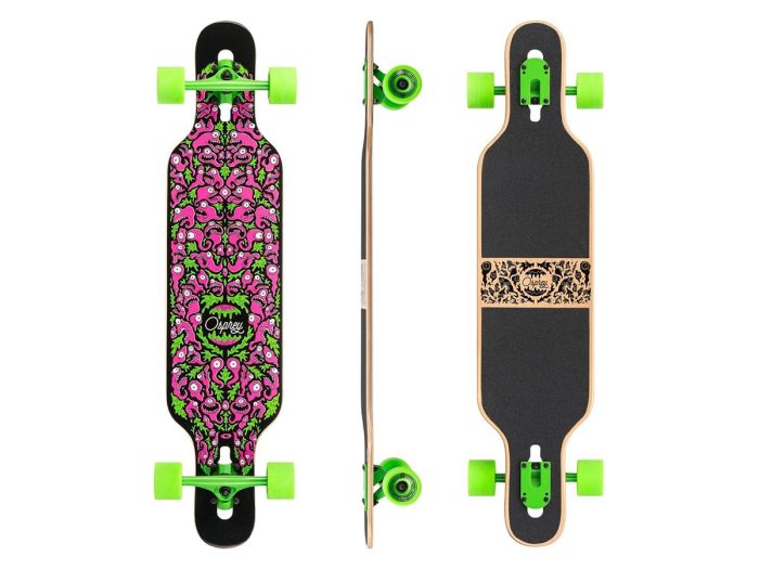 Dieses Osprey Longboard CHARACTER ist 99 cm lang. Die Doppelspitzenform verhindert das Einklemmen der Räder und ermöglicht so tiefe Kurvenfahrten. Aufgrund seiner Stabilität ist dieses Drop-Through-Board auch ein tolles Longboard für Anfänger. Die coolen grünen Rollen zusammen mit dem ausgeprägten Design verleihen diesem Longboard echten Charakter!