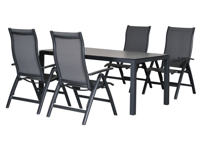 Das Outdoor Feelings Ampio Bahia Diningset besteht aus einem Gartentisch mit vier verstellbaren Gartenstühlen.
