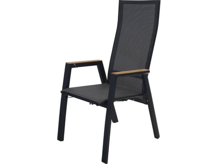 Der Stuhl hat eine Größe von 70 x 59,5 x 112 cm und eine Sitzhöhe von 45 cm. Das Gestell besteht aus Aluminium in mattem Anthrazit und die Armlehnen sind mit Teakholz verkleidet. Die Sitzfläche besteht aus wetterbeständigem Textil und der Verstellmechanismus funktioniert mittels einer Gasfeder.